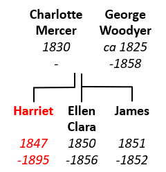 The 1851 Census showed the family in Blackheath, just to the northeast of Wonersh. 4-year-old Harriet retained her Mercer surname while Ellen’s was Woodyer 6. Harriet and Ellen gained a brother James later that year, but within just seven years, the family had been decimated 7.