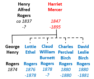 A daughter, Lottie Ethel, was born in November 1876, followed by Claud William Burnett in June 1878, both in the Guildford Union Workhouse 19, 20. On the official birth certificates, their father was given as Henry Alfred Rogers, fishmonger, but Workhouse birth records state that although Harriet was married, both children were illegitimate 21.