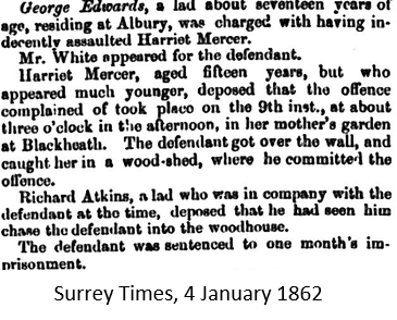 In late December that year, Harriet was subjected to an indecent assault at her Blackheath home. The County Bench at Guildford heard that George Edwards, aged about 17, climbed over the garden wall and assaulted Harriet, for which he received a one-month prison sentence 12.