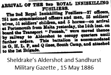 John, over 10 years younger than Harriet, was an Irishman serving with the 2nd Royal Inniskilling Fusiliers based in Aldershot since May 1886 31, 32.