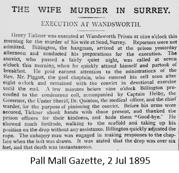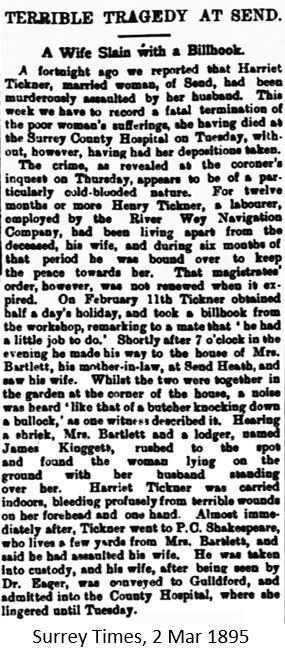 The unprovoked murder of former Guildford Union Workhouse inmate Harriet, struck with a billhook by her estranged husband Henry Tickner on her mother’s doorstep in Send, led to him paying the ultimate price in Wandsworth Gaol.