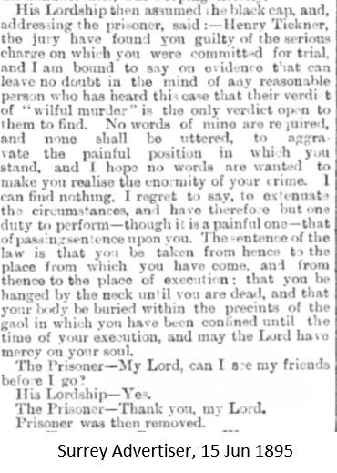 There was a large gallery for the trial held on 12th June 1895 at the Surrey Assizes in Guildford’s County Hall. Henry pleaded ‘not guilty’ to the charge of wilful murder of his wife Harriet, and spent much of the time hiding his face in a handkerchief 41.