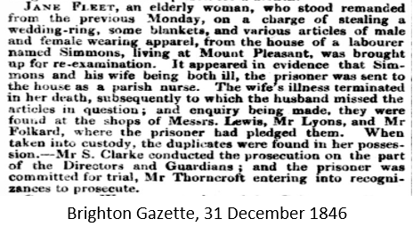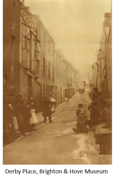 The family’s plight became worse still in May 1848 when Jane’s daughter Maria died from ‘epilepsy’, aged 28 25. She had been living in Egremont Street, described by an observer of the time as a street of ‘misery and vice’ 26. Jane’s other daughter Ann, a dressmaker, was also a resident of that street by 1851 lodging with the Hitchings’ family 27. Jane was no better off, residing in 1851 in Derby Place, Brighton, noted in a newspaper article as ‘one of the worst localities in the town’ 28, 29. Jane was working as a charwoman, living with her 11-year-old son William.