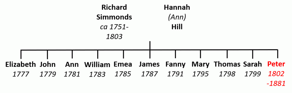 Peter was born in Ripley, Surrey on 25 June 1802 and baptised there exactly a month later 1.  He was the last child of Richard and Hannah (or Ann) Simmonds, as his father passed away just over seven months later in February 1803 2, 3.