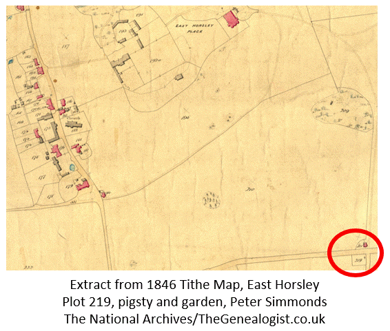 A tithe map of the East Horsley area drawn up in 1846 revealed that Peter had a small plot of land for a pigsty and garden for his own use, located opposite Park Lodge 7.