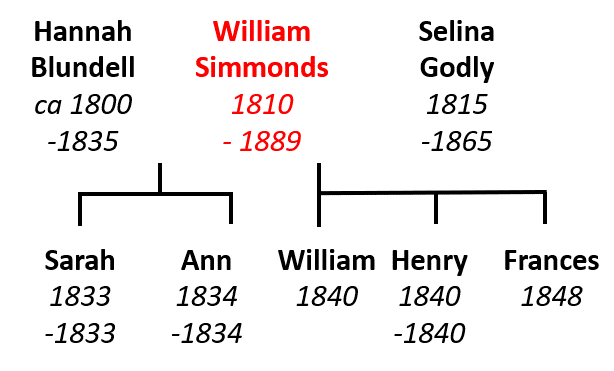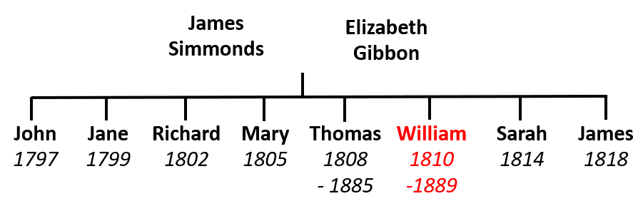 William was the sixth of eight known children for James and Elizabeth Simmonds and baptised on 9th December 1810 at St Mary’s Church, West Horsley, Surrey 1, 2. No occupation was recorded for William’s father James, but on the later baptism record of William’s sister Sarah in 1814, James was a shoemaker, and a parish clerk on his last child’s baptism record four years later.